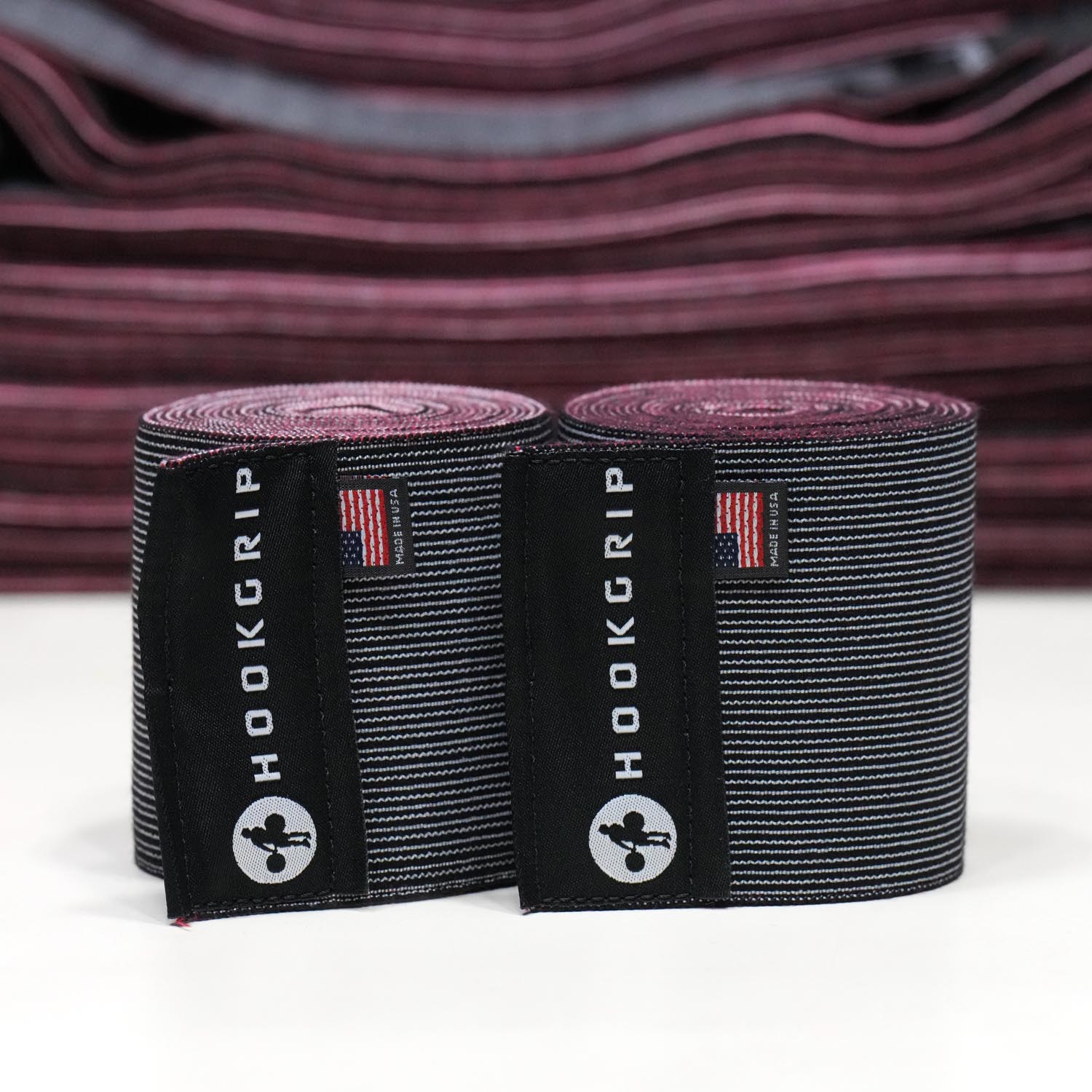 These are a USA made knee wrap — milled in California, sewn in New Jersey. The outside is black/white and the inside is red/white — they can be worn either way. The Made in USA tag is sewn on the black/white side on both ends.
